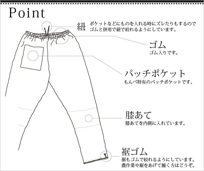 「もんぺ」というと腰回りのゆったりした農作業着のイメージが ありますが、普段履きしやすい様に、既存のもんぺと比較して腰回りを すっきりさせ細身にしています。