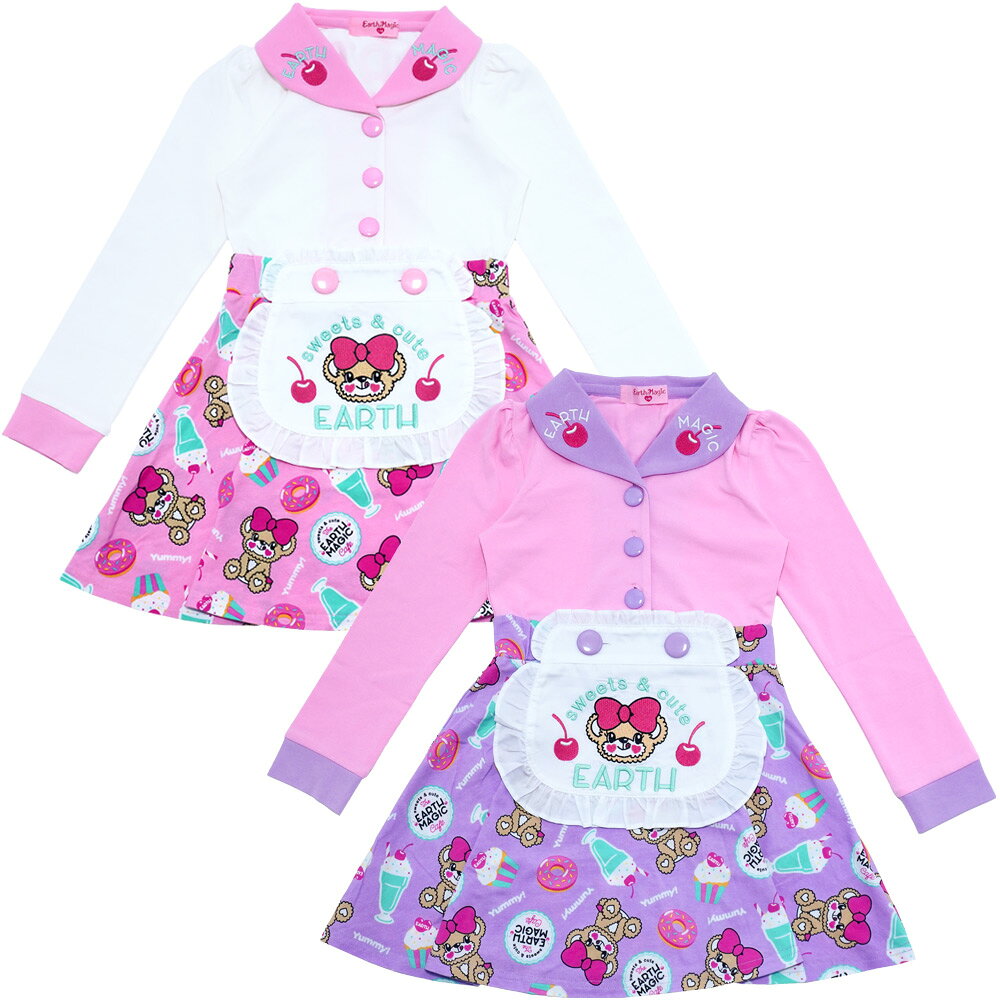 【EARTHMAGIC正規取扱店|8月30日入荷】アースマジック 2022秋冬 EARTHMAGIC Cafe総柄エプロン付きワンピース ピンク ラベンダー マフィー 刺繍 襟付き 女児 女の子 子供服 キッズ 100 110 120 130 140cm