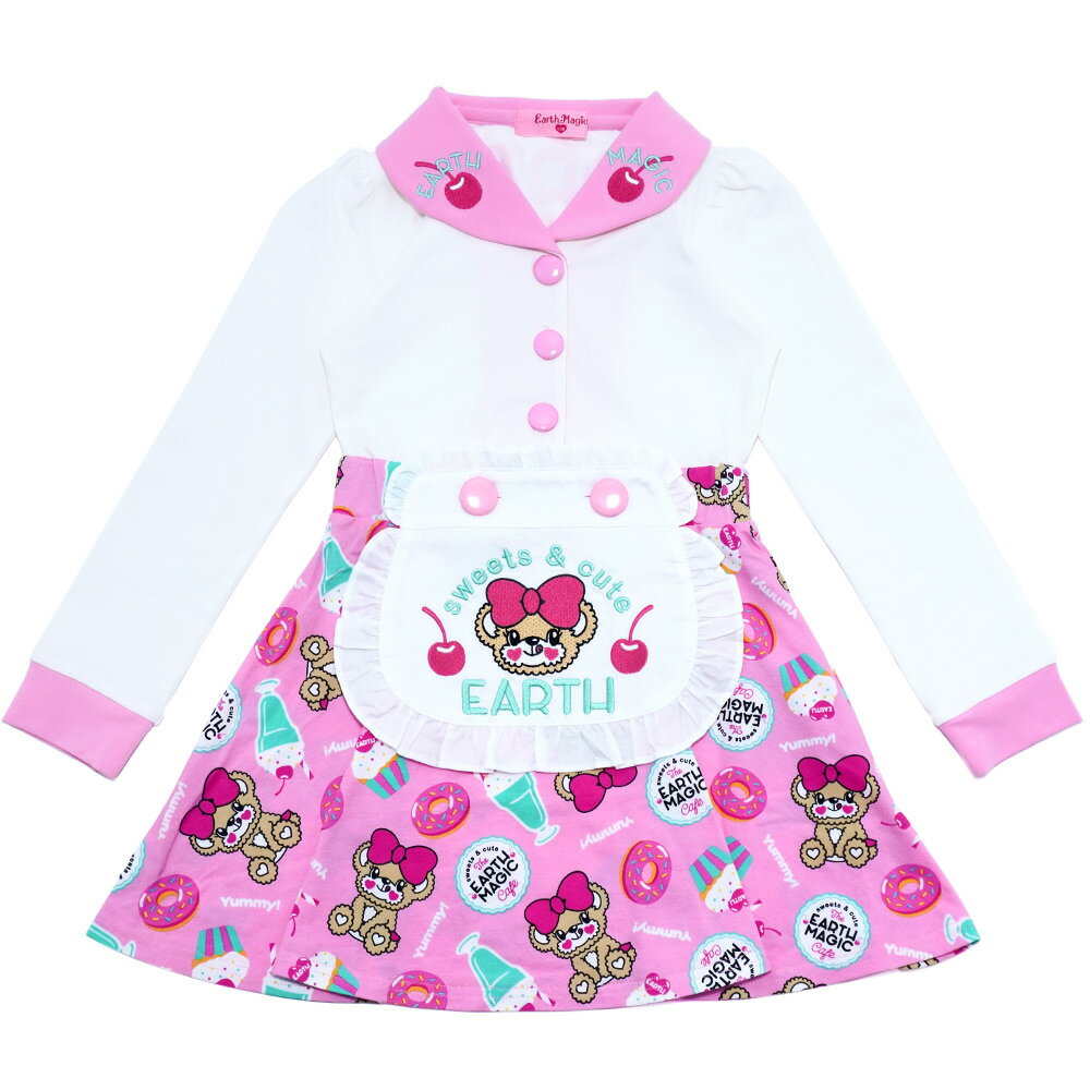 2022年 EARTHMAGIC(アースマジック)秋冬新作 ♥EARTHMAGIC Cafe総柄エプロン付きワンピース♥ P02:【134】ONEPIECE・【117】ACCESSORY・【140】SOCKS・【148】SHOES P05:【134】ONEPIECE・【117】ACCESSORY・【139】ACCESSORY・【140】SOCKS・【148】SHOES アースマジックならではのカラフルポップな色使い♥ 大きめのスイーツ柄が印象的なEARTHMAGIC Café総柄の登場です♥ 無地と総柄のバイカラーが目を引く襟付きワンピース。