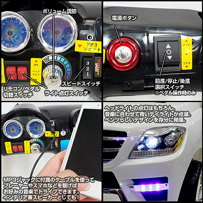 メルセデス・ベンツML350 4マチックが 1/5サイズの電動乗用カーになりました! 電源を入れるとリアルなエンジン音で動作開始! 公式ライセンスならではの細かなディティールと、 ライトやサウンドなど、楽しい機能が盛りだくさん! ペダルでの操作はもちろん、 付属のプロポでリモート操作も可能です。